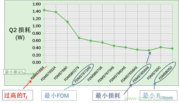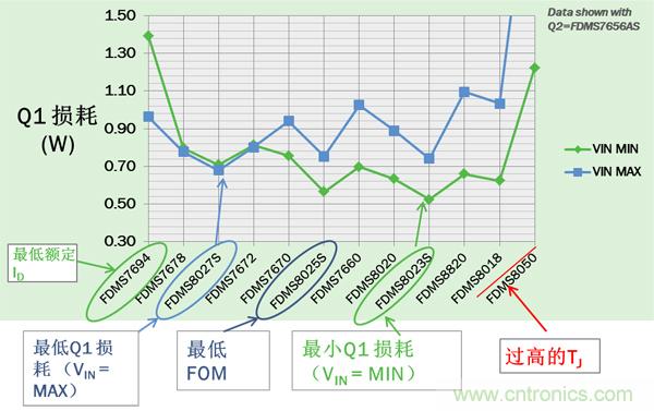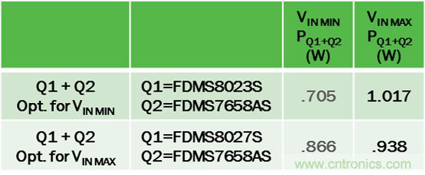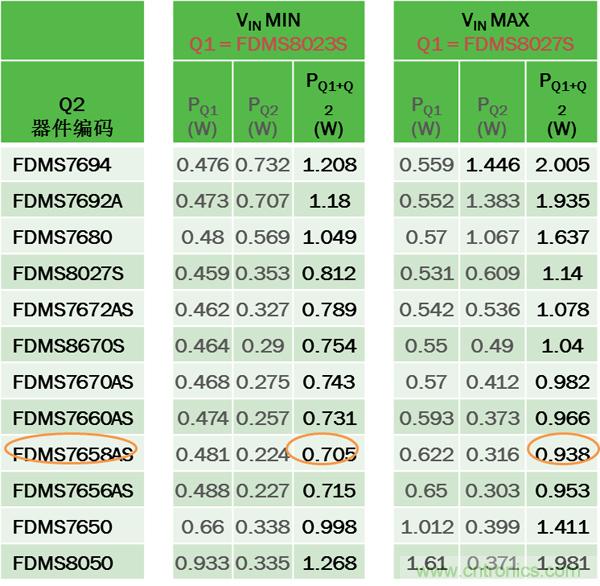 為優(yōu)化轉(zhuǎn)換器能效,首先根據(jù)VIN選擇損耗最小的Q1,然后選擇產(chǎn)生損耗最小的Q2。本例中, 無(wú)論VIN最小或最大,最佳的Q2是相同的,都為FDMS7658AS(但并不總是如此,特別是具有寬VIN范圍或高FSW時(shí))。