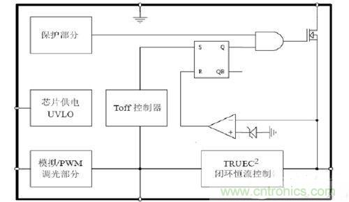 所謂開環(huán),不以檢測到的輸出電流值來做發(fā)出PWM信號(hào)的參考。所謂的閉環(huán),即真正檢測輸出電流值,以此為標(biāo)準(zhǔn)來發(fā)出PWM信號(hào)。從電路拓?fù)渖?,二者沒有區(qū)別。但是在芯片內(nèi)部對檢測到的如圖1 CS腳電感電流信號(hào),做專利技術(shù)處理,如圖2 TRUEC2部分。這樣,就檢測到了電感電流的平均值,也就是輸出電流的平均值。芯片針對檢測到的值,控制輸出占空比,實(shí)現(xiàn)了閉環(huán)控制。