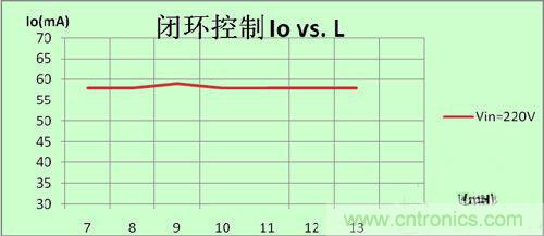 圖4可見,線性調(diào)整率為0,因?yàn)槿]環(huán)控制逐周期精確控制,輸入有任何變化,芯片會(huì)馬上檢測到并作相關(guān)的調(diào)整以便得到同樣的輸出;同理,如圖5及圖6,當(dāng)輸出電壓變化,電感量變化時(shí),芯片也會(huì)作相關(guān)的調(diào)整;正是因?yàn)槲覀兊娜]環(huán)高精度恒流控制方法,使電源做到了真正的恒流。這樣,量產(chǎn)的一致性可以控制到小于±1%.