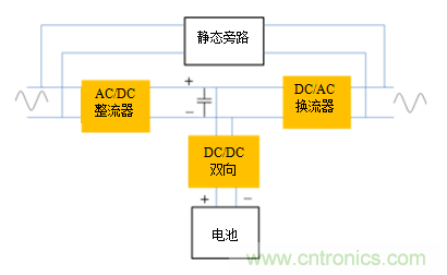 圖2:具有雙向DC-DC換流器的在線式UPS框圖