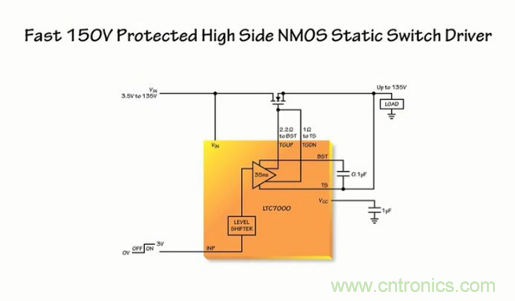 由此可見,作為一款靈活和堅固的器件,可使汽車和工業(yè)制造商提高其系統(tǒng)的性能和可靠性。LTC7000 所具備的高達 135V 的電壓范圍、內(nèi)置的保護功能、強大的驅(qū)動器、快速接通和關(guān)斷時間能力,使得制造商能夠開發(fā)出為客戶增添附加值和可靠性的系統(tǒng)。因而它主要運用于靜態(tài)開關(guān)驅(qū)動器、負載和電源開關(guān)驅(qū)動器、電子閥驅(qū)動器以及高頻高壓柵極驅(qū)動器。