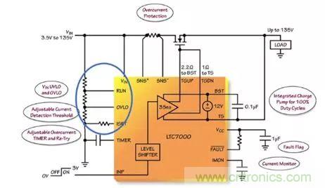 LTC7000 能夠避免負載遭受 VIN 引腳上的過壓和欠壓情況的損壞。“一個連接在 VIN 和地之間、且抽頭連接至 RUN 和 OVLO 引腳的簡單電阻分壓器將設定一個針對負載的有效操作窗口。當 VIN 位于由 RUN 和 OVLO 引腳所設定的操作窗口之外時,則關(guān)斷外部 MOSFET,并保護負載免遭潛在損壞或發(fā)生故障。” Mark Mullen這樣談到。