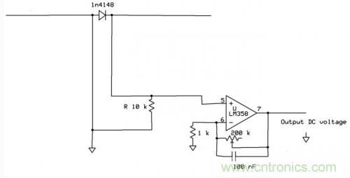 DC的輸出電壓還可以用LM358上的另一個(gè)運(yùn)放在進(jìn)行一次放大。圖中的100nF電容起到對(duì)整流后的電信號(hào)進(jìn)一步濾波的作用。