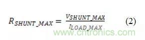 計(jì)算最大分流電阻。當(dāng)來(lái)自負(fù)載(ILOAD)的電流流過(guò)分流電阻器(RSHUNT)時(shí),分流電阻器上會(huì)形成一個(gè)電壓電位(VSHUNT)。VSHUNT被視為系統(tǒng)負(fù)載的“接地端”。因此,建議將VSHUN的最大負(fù)載電流保持在100mV以下,以避免在與其它具有真正0V接地的系統(tǒng)連接時(shí)出現(xiàn)問(wèn)題。公式2用于計(jì)算RSHUNT值: