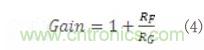 公式4用于計(jì)算放大器反饋網(wǎng)絡(luò)中的電阻RF和RG的大小,以此來(lái)設(shè)置公式3中計(jì)算出的增益: