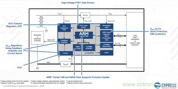 如圖2所示,CCG3PA具有高集成度,與通過使用分立組件實(shí)現(xiàn)的功能等效系統(tǒng)相比,具有組件數(shù)量更少、電路板占位面積更小、電路板布局更簡單以及材料成本和PCB成本更低的優(yōu)勢。