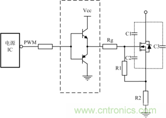 電源IC直接驅(qū)動(dòng)是我們最常用的驅(qū)動(dòng)方式,同時(shí)也是最簡(jiǎn)單的驅(qū)動(dòng)方式,使用這種驅(qū)動(dòng)方式,應(yīng)該注意幾個(gè)參數(shù)以及這些參數(shù)的影響。第一,查看一下電源IC手冊(cè),其最大驅(qū)動(dòng)峰值電流,因?yàn)椴煌酒?,?qū)動(dòng)能力很多時(shí)候是不一樣的。第二,了解一下MOSFET的寄生電容,如圖1中C1、C2的值。如果C1、C2的值比較大,MOS管導(dǎo)通的需要的能量就比較大,如果電源IC沒(méi)有比較大的驅(qū)動(dòng)峰值電流,那么管子導(dǎo)通的速度就比較慢。如果驅(qū)動(dòng)能力不足,上升沿可能出現(xiàn)高頻振蕩,即使把圖 1中Rg減小,也不能解決問(wèn)題!IC驅(qū)動(dòng)能力、MOS寄生電容大小、MOS管開(kāi)關(guān)速度等因素,都影響驅(qū)動(dòng)電阻阻值的選擇,所以Rg并不能無(wú)限減小。