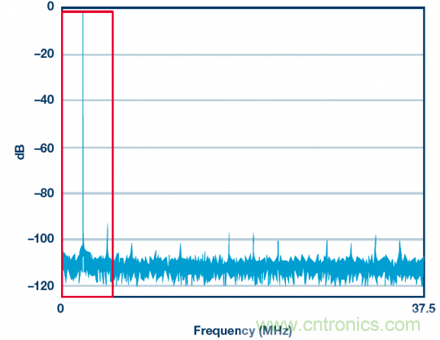 有多種方法可以減少落入紅框內(nèi)的噪聲量。其中一種是選擇具有更好SNR(噪聲更低)的ADC?;蛘咭部梢允褂孟嗤琒NR的ADC并提供更快的時(shí)鐘(比如150 MHz),從而讓噪聲分布在更寬的帶寬內(nèi),使紅框內(nèi)的噪聲更少。