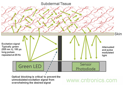 圖1展示了測(cè)量心率信號(hào)的基本方法,它依賴于用光學(xué)方法從人體組織上提取的心率壓力波。圖1說(shuō)明了光進(jìn)入皮膚后傳輸?shù)耐緩剑河尚穆蕢毫Σㄒ鸬拿?xì)血管舒張和收縮運(yùn)動(dòng)對(duì)由綠色LED注入人體組織的光信號(hào)進(jìn)行了調(diào)制。接收到的信號(hào)因?yàn)橥ㄟ^(guò)了皮膚而被大大地衰減,它被一個(gè)光電管接收并送到電子子系統(tǒng)中去處理。源自脈搏的振幅調(diào)制信號(hào)被檢測(cè)(過(guò)濾掉運(yùn)動(dòng)噪聲)、分析和顯示。