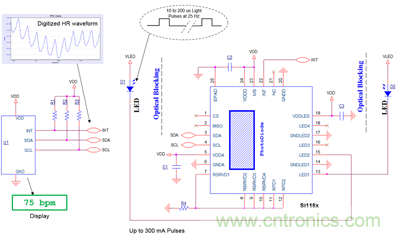 圖3. 一個(gè)只需要外部LED的集成化心率傳感器
