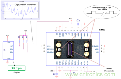 圖3所示的方法可以實(shí)現(xiàn)高性能的心率檢測(cè)解決方案,它并不是一些設(shè)計(jì)師所期望的小型化或高功效方案。 為了實(shí)現(xiàn)更小的解決方案,LED片芯和控制芯片必須被集成到同一個(gè)封裝中,其中集成了所有的必需的功能,包括光學(xué)單元和可以改善LED輸出的透鏡。圖4說(shuō)明了這種集成度更高的解決方案,它基于Silicon Labs的Si117x光學(xué)傳感器。