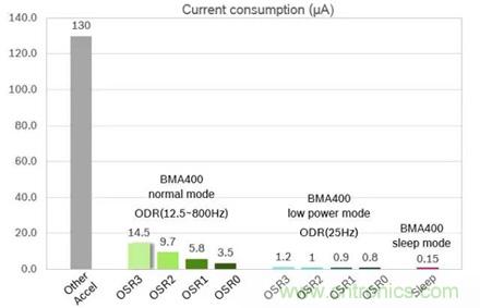 而BMA400單體集成了這些功能,實際僅需要3.9uA的電流(配合低功耗模式的自動切換,還可以進(jìn)一步降低),從而可以在滿足同等功能的情況下,顯著降低系統(tǒng)地總功耗,從而延長系統(tǒng)的待機(jī)時間。