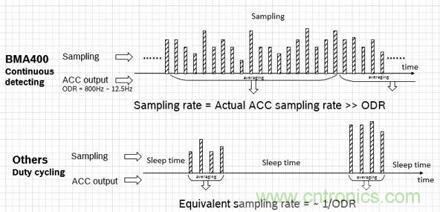 可是,如我們前述“加速度傳感器在物聯(lián)網(wǎng)應(yīng)用中扮演重要角色”,傳感性能決定了系統(tǒng)能否基于傳感器做出精準(zhǔn)的識別和決策。為了提高對原始信號的有效采集,并降低噪聲及高頻信號的干擾(混疊Aliasing),BMA400在正常工作模式下,采用了連續(xù)采樣和滑動低通濾波的方式。