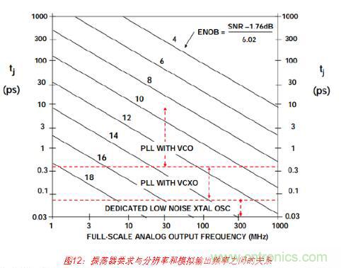 圖12顯示的是與圖10相同的數(shù)據(jù),但其中針對各種分辨率要求繪制出與模擬輸出頻率成 函數(shù)關(guān)系的最大允許抖動。根據(jù)最大輸出頻率和ENOB中所需分辨率來選擇采樣時鐘發(fā)生 器類型,應以此圖片作為大概準則。具有標準VCO的PLL方法就是產(chǎn)生采樣時鐘的一種 不錯方式,其中均方根(RMS)抖動要求大約為1 ps或以上。不過,亞皮秒抖動要求采用基 于VCXO的PLL或?qū)S玫驮肼暰w振蕩器。“教程MT-008”介紹了如何將振蕩器相位噪聲轉(zhuǎn) 換成抖動。