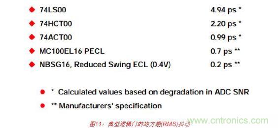 為了顯示這些抖動值的重要性,請考慮與一組邏輯門相關(guān)的均方根(RMS)抖動典型值,如 圖11所示。74LS00、74HCT00和74ACT00的值都是采用參考文獻1第5章所述的方法以高 性能ADC(孔徑抖動小于0.2-ps rms)測得的,其中抖動是從因多個相同門串聯(lián)而導致的FFT SNR降低計算得出的。然后,通過除以串聯(lián)門總數(shù)的平方根,便可計算出單個門所造成 的抖動。制造商給出了MC100EL16和NBSG16的抖動數(shù)據(jù)。
