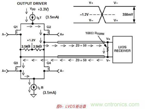 當并行數(shù)據(jù)速率超過約100 MSPS時,由于不太可能會產(chǎn)生CMOS邏輯電平以上的瞬變干 擾,因此通常使用低電平電流模式差分邏輯(PECL、較低級別的PECL或LVDS等)(見圖 9)。這樣可幫助最大程度地減少因碼相關(guān)毛刺而產(chǎn)生的失真。例如,AD9734/AD9735/ AD9736 DAC系列采用1.2 GSPS并接受LVDS輸入邏輯電平。片上包含特殊電路,以確保 輸入數(shù)據(jù)相對于DAC時鐘具有正確時序