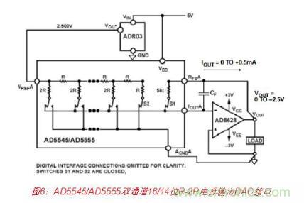 基于R-2R的電流輸出DAC的輸出阻抗與碼字有關(guān),因此其輸出必須驅(qū)動運算放大器的虛 擬地,以便維持線性。16/14位DAC AD5545/AD5555都是此種架構(gòu)的很好范例。圖6所示為 一種合適的接口電路,其中ADR03用作2.5 V基準電壓源,而AD8628斬波穩(wěn)定運算放大器 用作輸出I/V轉(zhuǎn)換器。