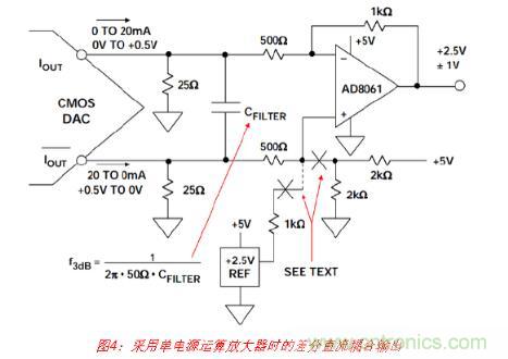但是應注意,與差分工作模式相比,以這種方式使用DAC的單端輸出時,共模抑制性能將 下降,且2階失真產(chǎn)物將增加。