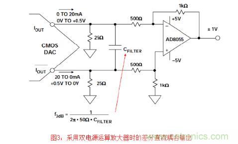需要低至DC的頻率響應時,可以連接運算放大器作為差分轉(zhuǎn)單端轉(zhuǎn)換器來獲取單端輸 出。 在圖3中,運算放大器AD8055用于實現(xiàn)高帶寬和低失真。電流輸出DAC驅(qū)動平衡的 25 Ω阻性負載,從而在各輸出端產(chǎn)生0至+0.5 V的錯相電壓。這項技術(shù)用于代替直接I/V轉(zhuǎn) 換,從而防止高壓擺率DAC電流導致放大器過載和引入失真。必須小心地處理使DAC輸 出電壓位于其順從電壓額定值范圍之內(nèi)。