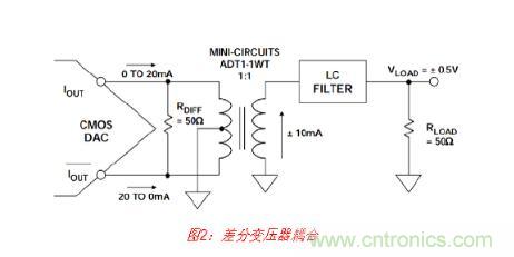 變壓器不僅用于將差分輸出轉(zhuǎn)換成單端信號,而且還將DAC的輸出與LC濾波器的抗性負 載隔離開來,因而可以改善整體失真性能。