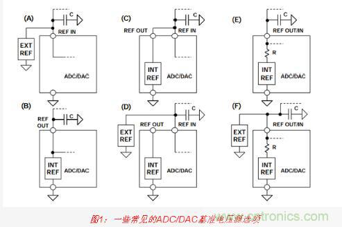 各種各樣的ADC和DAC以各種各樣的方式支持使用外部基準電壓源來替代內(nèi)部基準電壓源。圖1所示為一些常見配置(但顯然并不是全部)。