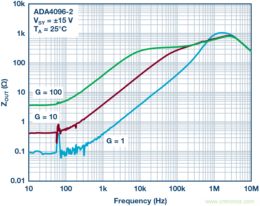 圖8b. ADA4096-2數(shù)據(jù)手冊(cè)中的閉環(huán)阻抗圖