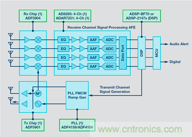 ADI公司負(fù)責(zé)24GHz芯片組的應(yīng)用工程師Patrick Walsh在介紹此方案時指出,這是ADI最新的開發(fā)平臺——演示雷達(dá),演示雷達(dá)是一款完整的天線到比特解決方案,擁有完整的ADI信號鏈。這個產(chǎn)品包括一個兩通道發(fā)送,四通道接收解決方案,提供執(zhí)行FM-CW調(diào)制的斜坡PLL,ADC可以將基帶信號轉(zhuǎn)換進(jìn)入DSP,為我們提供完整的信號鏈。該演示雷達(dá)只需連接USB和電源,用戶就可以啟動運行,在幾分鐘之內(nèi)收到雷達(dá)信號。