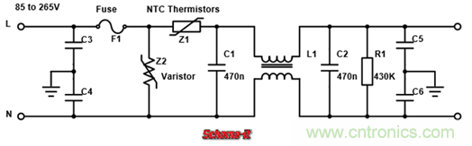 為了解決這一問題,最簡單方法加一個(gè)NTC熱敏電阻(如下圖1中的Z1)來減小涌浪電流的大小,此時(shí)通電瞬間的浪涌電阻相當(dāng)于電壓除以NTC熱敏電阻與濾波電容的等效串聯(lián)電阻之和