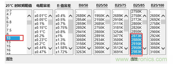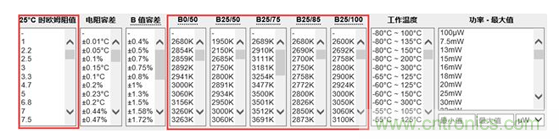圖3,從Digi-Key網(wǎng)站中很快篩選適當(dāng)NTC熱敏電阻參數(shù)