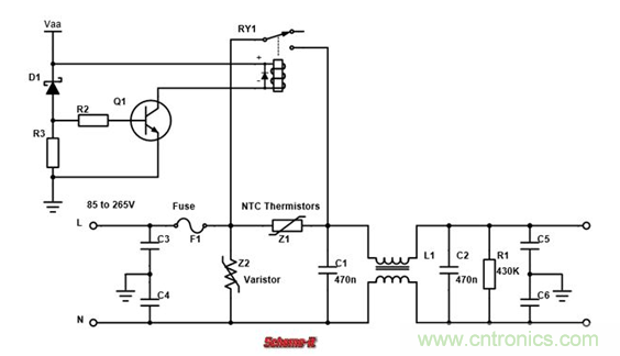 繼電器初始是斷開的。當(dāng)Vaa逐漸達(dá)到自身電壓的時(shí)候,齊納二極管D1導(dǎo)通,三極管Q1打開,繼電器RY1閉合,相當(dāng)于把限流NTC熱敏電阻Z1短路。
