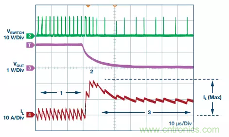 最初,峰值電感電流由選定的電感值、電源開關(guān)導(dǎo)通時間、電路的輸入和輸出電壓以及負載電流設(shè)置(圖中用“1”表示)。當電路短路時,電感電流迅速上升,直至達到限流點,即 RS × IINDUCTOR (IL)等于最大電流檢測電壓,以保護器件和下游電路(圖中用“2”表示)。然后,內(nèi)置電流折返限制(圖中數(shù)字“3”)進一步降低電感電流,以將熱應(yīng)力降至最低。