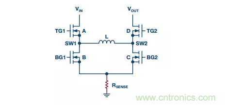圖8顯示了一個4開關(guān)升降壓轉(zhuǎn)換器,其檢測電阻位于低端。當輸入電壓遠高于輸出電壓時,轉(zhuǎn)換器工作在降壓模式;當輸入電壓遠低于輸出電壓時,轉(zhuǎn)換器工作在升壓模式。在此電路中,檢測電阻位于4開關(guān)H橋配置的底部。器件的模式(降壓模式或升壓模式)決定了監(jiān)測的電流。