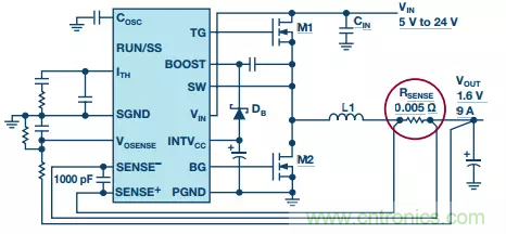 使用RSENSE和DCR兩種檢測方法時,由于檢測信號較小,故均需要開爾文檢測。必須讓開爾文檢測痕跡(圖5中的SENSE+和 SENSE-)遠離高噪聲覆銅區(qū)和其他信號痕跡,以將噪聲提取降至最低,這點很重要。某些器件(如LTC3855)具有溫度補償DCR檢測功能,可提高整個溫度范圍內(nèi)的精度。