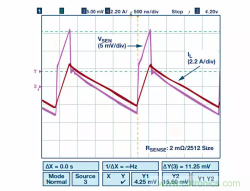 檢測電阻ESL的影響可能很輕微,也可能很嚴重。ESL會導(dǎo)致開關(guān)柵極驅(qū)動器發(fā)生明顯振蕩,從而對開關(guān)導(dǎo)通產(chǎn)生不利影響。它還會增加電流檢測信號的紋波,導(dǎo)致波形中出現(xiàn)電壓階躍,而不是預(yù)期的如圖13所示的鋸齒波形。這會降低電流檢測精度。