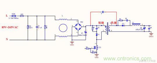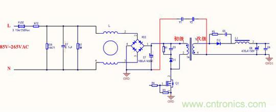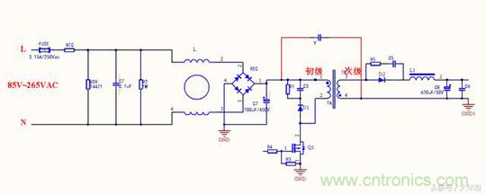 變壓器的每個線圈繞組之間有寄生電容存在,在工作時過程當(dāng)中形成電壓,成為噪聲源頭,在初始高壓與次級地之間跨接Y電容,能濾除初級和次級耦合產(chǎn)生的共模干擾,這與第一種差不多,只是在EMI測試時候結(jié)果會有所不同。