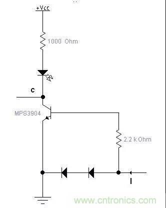 如果簡單的用三極管導(dǎo)通與截止來檢測電流的話,三極管開啟要0.7V左右,電流比較小的時候需要串比較大的采用電阻,同時浪費(fèi)較大的反饋電壓,如上圖方法,可以用比較小的電阻,消耗很小的電壓就能檢測到電流I,通過調(diào)整三極管基機(jī)電阻可以調(diào)整檢測的靈敏度。這個電路可以用在充電器等需要顯示有沒有充電電流的地方。