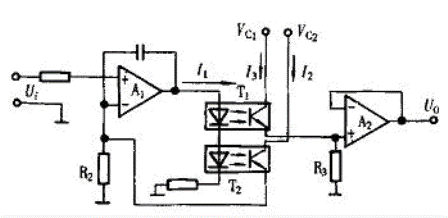 - 利用2個(gè)具有相同非線性傳輸特性的光電耦合器以及2個(gè)射極跟隨器