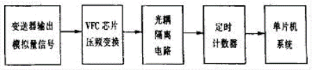 另一種模擬量傳輸?shù)慕鉀Q方法,就是采用VFC(電壓頻率轉(zhuǎn)換)方式,如圖3所示。現(xiàn)場(chǎng)變送器輸出模擬量信號(hào)(假設(shè)電壓信號(hào)),電壓頻率轉(zhuǎn)換器將變送器送來的電壓信號(hào)轉(zhuǎn)換成脈沖序列,通過光耦隔離后送出。在主機(jī)側(cè),通過一個(gè)頻率電壓轉(zhuǎn)換電路將脈沖序列還原成模擬信號(hào)。此時(shí),相當(dāng)于光耦隔離的是數(shù)字量,可以消除光耦非線性的影響。這是一種有效、簡(jiǎn)單易行的模擬量傳輸方式。