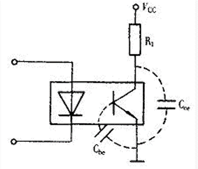 由于光耦自身存在的分布電容,對(duì)傳輸速度造成影響,光敏三極管內(nèi)部存在著分布電容Cbe和Cce,如圖4所示。由于光耦的電流傳輸比較低,其集電極負(fù)載電阻不能太小,否則輸出電壓的擺幅就受到了限制。但是,負(fù)載電阻又不宜過大,負(fù)載電阻RL越大,由于分布電容的存在,光電耦合器的頻率特性就越差,傳輸延時(shí)也越長(zhǎng)。
