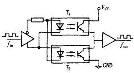 用2只光電耦合器T1,T2接成互補(bǔ)推挽式電路,可以提高光耦的開關(guān)速度,如圖5所示。當(dāng)脈沖上升為“1”電平時(shí),T1截止,T2導(dǎo)通。相反,當(dāng)脈沖為“0”電平時(shí),T1導(dǎo)通,T2截止。這種互補(bǔ)推挽式電路的頻率特性大大優(yōu)于單個(gè)光電耦合器的頻率特性。