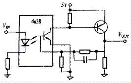 此外,在光敏三極管的光敏基極上增加正反饋電路,這樣可以大大提高光電耦合器的開關(guān)速度。如圖6所示電路,通過增加一個(gè)晶體管,四個(gè)電阻和一個(gè)電容,實(shí)驗(yàn)證明,這個(gè)電路可以將光耦的最大數(shù)據(jù)傳輸速率提高10倍左右。