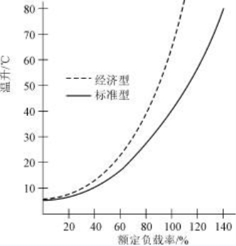 環(huán)形變壓器的溫升特性曲線示于圖6,從圖6 可看出環(huán)形變壓器的溫升是較低的,對標(biāo)準(zhǔn)型系列,即便是過載120%,溫升也不超過70℃。