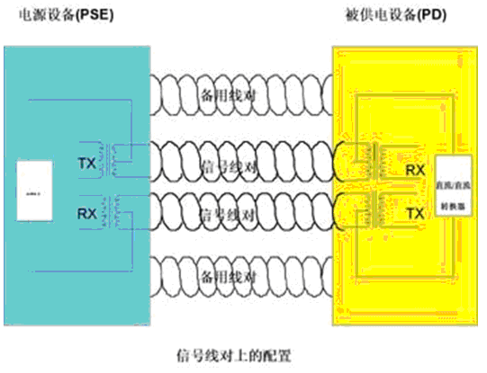 ---IEEE 802.3af標(biāo)準(zhǔn)把電源定義為13W 48V,可以通過五類信號線對配置從PSE發(fā)送這一功率,其中功率從發(fā)射機(Tx)和接收機(Rx)信號變壓器中央分接。還可以通過五類備用線對配置傳送這一電源,參見圖1。