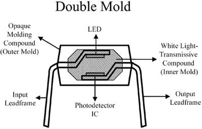 然后,組合好的引線框使用白色光傳導化合物進行澆鑄,構(gòu)成光導裝置,把光從LED傳送到IC光電檢測器上。白色化合物還提供了高壓絕緣功能。最后,得到的組件使用不透明的化合物澆鑄,構(gòu)成最終的封裝輪廓。