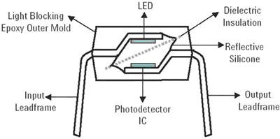 光學耦合器的工作基礎(chǔ)是LED發(fā)出的光通過透明的絕緣介質(zhì)到光電探測器,這種介質(zhì)提供2.5kV-6kV范圍的高壓絕緣。光耦合程度取決于光導材料。絕緣將通過光導材料本身或通過額外的光傳導介電材料實現(xiàn)。在任何情況下,LED的排列、光導材料、介電材料和IC都會直接影響光耦合和高壓絕緣的性能。