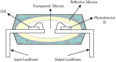 光電二極管芯片采用兩個透明的層:SiO2鈍化/絕緣和光傳導聚酰亞胺。LED使用透明的連接層穩(wěn)固地連接到光電二極管上。IC使用銀環(huán)氧樹脂,通過模具連接到引線框上。介電材料使用光傳導環(huán)氧樹脂連接到IC上。LED模具使用光傳導環(huán)氧樹脂連接到介電材料上。最后,組件使用焊接線和澆鑄。它使用標準模具連接工藝,完成所有放置,封裝在單次不透明澆鑄化合物中完成澆鑄。