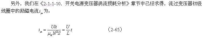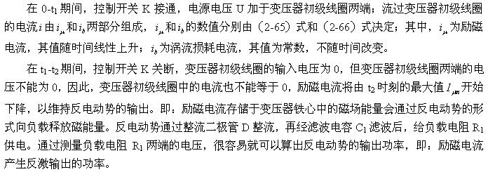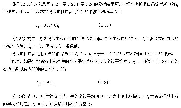 順便指出:(2-84)式的結(jié)果,是認(rèn)為渦流損耗在t1-t2期間(圖2-26-b)完全等于0而求得的,但實(shí)際上,在t1-t2期間變壓器初級(jí)線圈產(chǎn)生的反電動(dòng)勢(shì)同樣也會(huì)在變壓器鐵芯中感應(yīng)產(chǎn)生渦流損耗電流,即當(dāng)輸入電壓為0時(shí)刻,在變壓器鐵芯中還存在很短暫時(shí)間的渦流損耗;由于這種渦流損耗是由反電動(dòng)勢(shì)提供能量來維持的,它將隨著反電動(dòng)勢(shì)能量的衰減很快就衰減到0。
