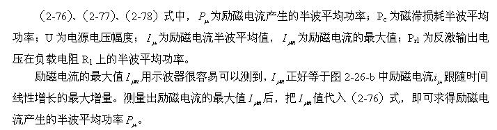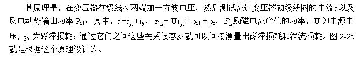 因此,(2-81)、(2-82)、(2-83)、(2-84)式最好只用于對(duì)正激式輸出的單激式開關(guān)電源變壓器進(jìn)行磁滯損耗和渦流損耗功率測(cè)試,因?yàn)槠涑跫?jí)線圈的電感相對(duì)比較大,勵(lì)磁電流比較??;如果需要對(duì)反激式輸出的單激式開關(guān)電源變壓器進(jìn)行測(cè)試,最好只用于對(duì)小功率開關(guān)電源進(jìn)行對(duì)比測(cè)試。