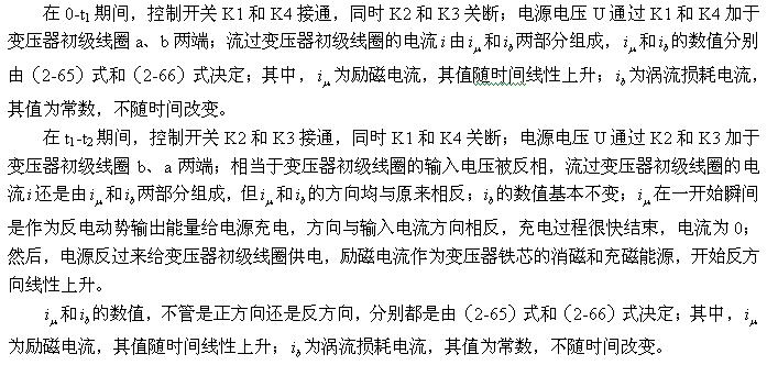 根據(jù)前面分析,磁滯損耗主要由勵磁電流 產生的,但雙激式開關變壓器初級線圈中的勵磁電流與單激式開關變壓器初級線圈中的勵磁電流產生的作用并不完全相同。單激式開關變壓器初級線圈中的勵磁電流產生磁場對變壓器貼芯進行充磁和退磁外,其存儲的能量只能用來作為反激式輸出給負載,因為變壓器初級線圈輸入的電壓是單極性脈沖,變壓器初級線圈無法換相。