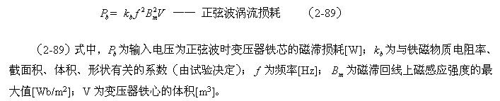 這里順便指出,利用(2-88)和(2-89)式來分別測試變壓器鐵心的磁滯損耗和渦流損耗是非常困難的;一個是它們的系數(shù)很難決定,另一個是兩者很難分別進行測量,或從測量結果中進行分離。對比兩式的參數(shù)就可以知道,它們之間最大的區(qū)別是頻率對損耗的影響程度;一個是與頻率成正比,另一個是與頻率的平方成正比。